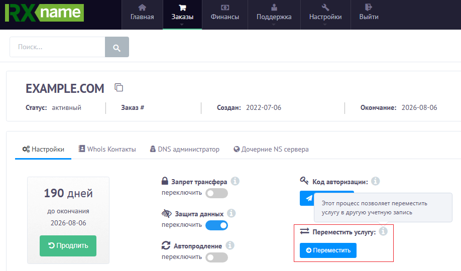 1. В меню настроек домена найдите и выберите опцию «Переместить услугу» в другой аккаунт RX-NAME.